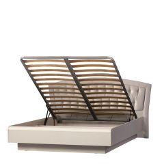 «кремовый белый», который уже успел полюбиться клиентам фабрики по серии «Марлен», но отличается более современным дизайном. В нем отсутствуют замысловатые декоративные элементы и колонны, на первый план выходят прямые линии. Украшением комплекта служат оригинальные итальянские ручки золотистого цвета. В оформлении фасадов комода сделан необычный ход. Некоторые линии, делящие ящики на, казалось бы, самостоятельные отсеки, на самом деле являются фрезеровкой. Кровать оснащена мягким тканевым изголовьем, что является сейчас безусловным трендом.